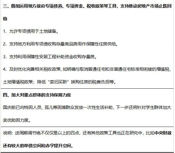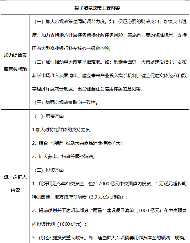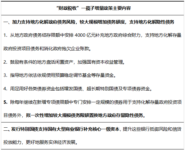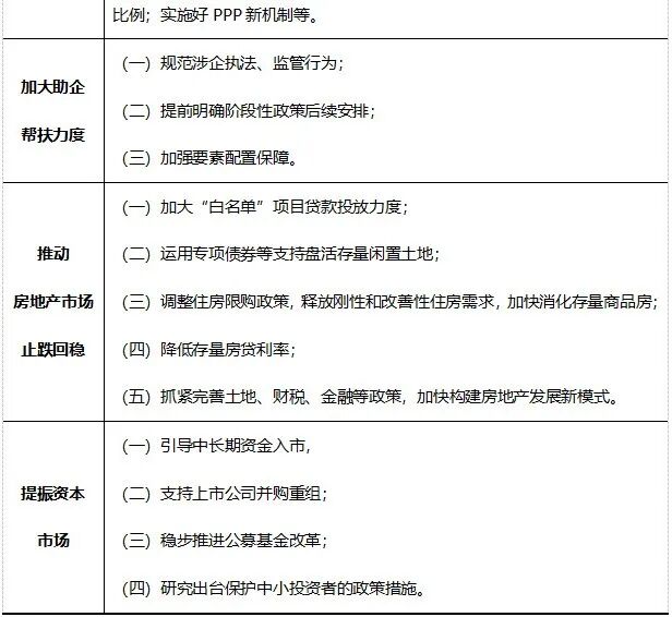 一攬子增量政策推出,城投公司該如何作為?近期,中央政治局會議提出“加大逆周期調(diào)節(jié)力度”,金融、發(fā)改、財(cái)政、住建等部門先后宣布推出“一攬子增量政策”,重點(diǎn)圍繞加力提效實(shí)施宏觀政策、進(jìn)一步擴(kuò)大內(nèi)需、加大助企幫扶力度、促進(jìn)房地產(chǎn)市場止跌回穩(wěn)和努力提振資本市場五個(gè)方面。對于地方政府和城投公司來說,如何推動(dòng)一攬子增量政策落地,搶抓重大機(jī)遇,最大程度釋放政策利好是當(dāng)前各地政府和城投公司工作的重點(diǎn)。 一、一攬子增量政策的提出 當(dāng)下,全球經(jīng)濟(jì)增長速度變緩,貿(mào)易保護(hù)主義加劇,市場上不確定不穩(wěn)定的因素增多。疫情過后,我國經(jīng)濟(jì)在回暖中仍面臨著新的挑戰(zhàn)和壓力。針對當(dāng)前經(jīng)濟(jì)運(yùn)行中的新情況新問題,國家加力推出一攬子增量政策,推動(dòng)經(jīng)濟(jì)持續(xù)回升向好。 2024年7月30日召開的中共中央政治局會議指出,宏觀政策要持續(xù)用力、更加給力。要加強(qiáng)逆周期調(diào)節(jié),實(shí)施好積極的財(cái)政政策和穩(wěn)健的貨幣政策,加快全面落實(shí)已確定的政策舉措,及早儲備并適時(shí)推出一批增量政策舉措!霸隽空摺庇纱硕鴣怼 2024年9月24日,央行、金融總局、證監(jiān)會(“一行一局一會”)在國新辦新聞發(fā)布會上系統(tǒng)介紹貨幣金融政策,包括降低存款準(zhǔn)備金率和政策利率、降低存量房貸利率和統(tǒng)一房貸最低首付比例、創(chuàng)設(shè)新的貨幣政策工具支持股票市場穩(wěn)定發(fā)展等,進(jìn)一步支持經(jīng)濟(jì)的穩(wěn)定增長。 2024年9月26日,中央政治局召開會議,分析研究當(dāng)前經(jīng)濟(jì)形勢,部署下一步經(jīng)濟(jì)工作,提出要有效落實(shí)存量政策,加力推出一攬子增量政策。 2024年9月29日,國務(wù)院召開常務(wù)會議,專題研究部署一攬子增量政策的具體落實(shí)工作。 2024年10月8日,國家發(fā)展改革委在國新辦新聞發(fā)布會上系統(tǒng)介紹了一攬子增量政策,包括宏觀政策逆周期調(diào)節(jié)、擴(kuò)大國內(nèi)有效需求、助企幫扶、房地產(chǎn)市場穩(wěn)定和資本市場提振五個(gè)方面。 2024年10月12日,財(cái)政部在國新辦新聞發(fā)布會上提出一攬子增量財(cái)政政策,包括加力支持地方化解政府債務(wù)風(fēng)險(xiǎn)、發(fā)行特別國債支持國有大型商業(yè)銀行補(bǔ)充核心一級資本、疊加運(yùn)用專項(xiàng)債、專項(xiàng)資金、稅收政策等工具支持推動(dòng)房地產(chǎn)市場止跌回穩(wěn)、加大對重點(diǎn)群體的支持保障力度等。 2024年10月14日,國家市場監(jiān)督管理總局等四部門在國新辦新聞發(fā)布會上介紹了助企幫扶的增量政策,具體措施包括優(yōu)化無還本續(xù)貸政策、精準(zhǔn)扶持不同經(jīng)營主體發(fā)展等。 2024年10月17日,住房城鄉(xiāng)建設(shè)部、財(cái)政部、央行等五部門在國新辦新聞發(fā)布會上提出了推動(dòng)房地產(chǎn)市場止跌回穩(wěn)的政策“組合拳”,包括四個(gè)取消、四個(gè)降低、兩個(gè)增加。 隨著一攬子增量政策陸續(xù)落地,目前已有浙江、江西、河北、河南等多個(gè)省份就落實(shí)一攬子增量政策、用好國家政策紅利表態(tài)或出臺方案、措施。 二、一攬子增量政策的特點(diǎn) 一攬子增量政策既重視發(fā)力解決當(dāng)下存在的困難和問題,更關(guān)注、更重視解決經(jīng)濟(jì)中長期發(fā)展中的重大問題,強(qiáng)化打基礎(chǔ)、利長遠(yuǎn)、可持續(xù)、穩(wěn)中有進(jìn),推動(dòng)高質(zhì)量發(fā)展。此次一攬子增量政策,可以概括為三個(gè)特點(diǎn),即三個(gè)“更加注重”、四個(gè)“堅(jiān)持”、五個(gè)“針對”。 表1 一攬子增量政策的特點(diǎn) 三、一攬子增量政策的具體內(nèi)容 (一)一攬子增量政策基本框架 2024年10月8日,國家發(fā)展改革委在國新辦新聞發(fā)布會上系統(tǒng)介紹了一攬子增量政策,包括宏觀政策逆周期調(diào)節(jié)、擴(kuò)大國內(nèi)有效需求、助企幫扶、房地產(chǎn)市場穩(wěn)定和資本市場提振五個(gè)方面。國家發(fā)改委提出本次一攬子增量政策的基本框架,是一個(gè)總體部署的落實(shí)方案。宏觀政策逆周期和跨周期調(diào)節(jié)是總體要求,擴(kuò)大國內(nèi)有效需求是我國經(jīng)濟(jì)工作的主攻方向;加大助企幫扶力度是創(chuàng)造良好的營商環(huán)境,激發(fā)經(jīng)營主體的活力;促進(jìn)房地產(chǎn)市場止跌回穩(wěn),可以防止因房地產(chǎn)市場波動(dòng)引發(fā)的系統(tǒng)性金融風(fēng)險(xiǎn);提振資本市場的關(guān)鍵是做到增強(qiáng)信心,穩(wěn)定預(yù)期。這五個(gè)方面是存在內(nèi)在的相應(yīng)聯(lián)系的。 表2 一攬子增量政策基本框架 (二)“貨幣金融”一攬子增量政策 2024年9月24日上午,國新辦舉行新聞發(fā)布會,央行行長潘功勝在發(fā)布會中提出了一系列支持經(jīng)濟(jì)高質(zhì)量發(fā)展的貨幣金融政策,此次宣布的貨幣政策力度大,效果好,超出市場預(yù)期。其中,降準(zhǔn)降息政策可以激發(fā)市場活力,降低社會融資成本,促進(jìn)消費(fèi)和投資;一攬子房地產(chǎn)金融政策旨在減輕購房者還款壓力、加快房地產(chǎn)去庫
