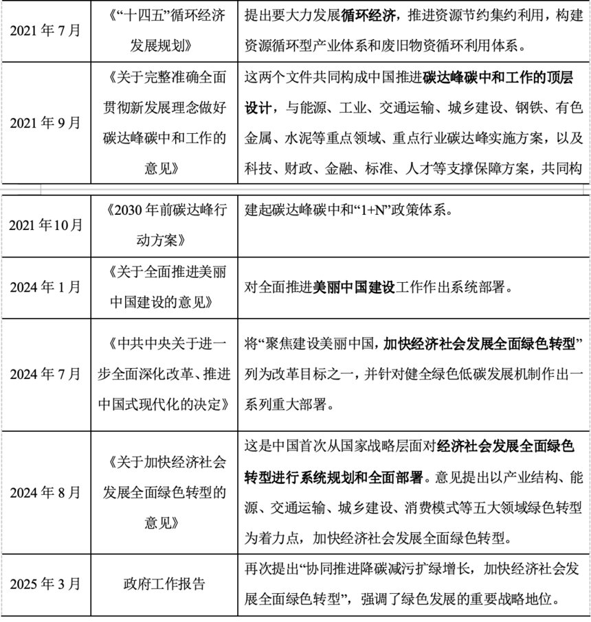 十五五規(guī)劃系列|“十五五”城投公司綠色低碳轉(zhuǎn)型路徑“十五五”已全面啟程,當(dāng)前正值城投公司戰(zhàn)略轉(zhuǎn)型與高質(zhì)量發(fā)展的關(guān)鍵階段。如何在機(jī)遇與挑戰(zhàn)交織的復(fù)雜環(huán)境中,把握方向、謀求突破,成為行業(yè)普遍關(guān)注的核心議題。為此,睿立方咨詢精心策劃并編制了“十五五”規(guī)劃五大專題文章,重點(diǎn)聚焦新質(zhì)生產(chǎn)力培育與發(fā)展路徑、產(chǎn)業(yè)化轉(zhuǎn)型路徑、數(shù)字化轉(zhuǎn)型路徑、綠色低碳轉(zhuǎn)型路徑以及投融資體系重構(gòu)等關(guān)鍵領(lǐng)域,力求為城投公司未來五年發(fā)展提供科學(xué)決策參考與系統(tǒng)行動指引。 今日推出第四篇:《“十五五”城投公司綠色低碳轉(zhuǎn)型路徑》,關(guān)注睿立方咨詢,可持續(xù)閱讀后續(xù)內(nèi)容。 隨著中國經(jīng)濟(jì)從高速增長階段轉(zhuǎn)向高質(zhì)量發(fā)展階段,綠色發(fā)展已經(jīng)成為統(tǒng)籌經(jīng)濟(jì)社會發(fā)展和生態(tài)環(huán)境保護(hù)的重要途徑。2005年8月15日,時(shí)任浙江省委書記的習(xí)近平同志,在湖州市安吉縣余村考察時(shí),首次提出“綠水青山就是金山銀山”的科學(xué)論斷。 2020年9月22日,國家主席習(xí)近平在第七十五屆聯(lián)合國大會上首次宣布“雙碳”目標(biāo)。2025年是“綠水青山就是金山銀山”理念提出20周年,也是我國提出“雙碳”目標(biāo)5周年,而“十五五”時(shí)期是我國實(shí)現(xiàn)2030年前碳達(dá)峰目標(biāo)的關(guān)鍵時(shí)期。 2024年8月,國務(wù)院發(fā)布《關(guān)于加快經(jīng)濟(jì)社會發(fā)展全面綠色轉(zhuǎn)型的意見》,首次從國家戰(zhàn)略層面對經(jīng)濟(jì)社會發(fā)展全面綠色轉(zhuǎn)型進(jìn)行系統(tǒng)規(guī)劃和全面部署,意見提出以產(chǎn)業(yè)結(jié)構(gòu)、能源、交通運(yùn)輸、城鄉(xiāng)建設(shè)、消費(fèi)模式等五大領(lǐng)域綠色轉(zhuǎn)型為著力點(diǎn),加快經(jīng)濟(jì)社會發(fā)展全面綠色轉(zhuǎn)型,形成節(jié)約資源和保護(hù)環(huán)境的空間格局、產(chǎn)業(yè)結(jié)構(gòu)、生產(chǎn)方式、生活方式。城投公司作為地方經(jīng)濟(jì)社會發(fā)展的重要支撐主體,應(yīng)積極踐行綠色發(fā)展理念,將綠色轉(zhuǎn)型的要求融入公司發(fā)展的整體戰(zhàn)略中,聚焦城鄉(xiāng)建設(shè)、交通運(yùn)輸、綜合能源、環(huán)保水務(wù)等領(lǐng)域,為構(gòu)建美麗中國、實(shí)現(xiàn)經(jīng)濟(jì)社會可持續(xù)發(fā)展貢獻(xiàn)力量。 當(dāng)前我國綠色發(fā)展已跨越初期的路徑探索,進(jìn)入政策與實(shí)踐深度融合、產(chǎn)業(yè)模式快速成型的新階段。綠色發(fā)展理念的提出及政策演變過程見附表。 一、綠色低碳循環(huán)發(fā)展經(jīng)濟(jì)體系的框架 黨的十九大提出了建立健全綠色低碳循環(huán)發(fā)展經(jīng)濟(jì)體系的任務(wù)。綠色是發(fā)展的全面要求和轉(zhuǎn)型主線,循環(huán)是提高資源效率的途徑,低碳是能源戰(zhàn)略調(diào)整,三者相輔相成、相互促進(jìn)的,構(gòu)成一個(gè)有機(jī)整體。構(gòu)建綠色低碳循環(huán)發(fā)展經(jīng)濟(jì)體系要以“雙碳”工作為引領(lǐng),以能源資源利用效率提升和生態(tài)環(huán)境質(zhì)量改善為重要導(dǎo)向,以推動形成綠色生產(chǎn)生活方式為主攻方向,以全面系統(tǒng)推動一、二、三產(chǎn)業(yè)全領(lǐng)域綠色發(fā)展和生產(chǎn)、流通、消費(fèi)全過程綠色發(fā)展為實(shí)施路徑,以改革創(chuàng)新為驅(qū)動。綠色低碳循環(huán)發(fā)展經(jīng)濟(jì)體系框架如下圖。 綠色低碳循環(huán)發(fā)展經(jīng)濟(jì)體系框架 二、城投公司綠色轉(zhuǎn)型路徑 綠色低碳是城投公司“十五五”時(shí)期重要的攻堅(jiān)轉(zhuǎn)型方向和任務(wù),這既是響應(yīng)國家“雙碳”戰(zhàn)略的號召,也是自身轉(zhuǎn)型升級、做優(yōu)做強(qiáng)做大的內(nèi)在需要。城投公司圍繞碳達(dá)峰碳中和目標(biāo),落實(shí)政策措施,聚焦城鄉(xiāng)建設(shè)、交通運(yùn)輸、綜合能源、環(huán)保水務(wù)等領(lǐng)域,有力有序有效推動綠色低碳轉(zhuǎn)型。 路徑一 優(yōu)化業(yè)務(wù)布局,打造綠色低碳產(chǎn)業(yè)新格局 城投公司應(yīng)積極踐行綠色發(fā)展理念,將綠色轉(zhuǎn)型的要求融入公司發(fā)展的整體戰(zhàn)略中,優(yōu)化業(yè)務(wù)布局,構(gòu)建綠色低碳產(chǎn)業(yè)體系。 一是推動傳統(tǒng)產(chǎn)業(yè)綠色低碳改造升級,圍繞產(chǎn)品設(shè)計(jì)、生產(chǎn)、物流、使用、回收利用等全生命周期綠色低碳轉(zhuǎn)型需求,實(shí)施全流程系統(tǒng)化改造升級。比如推動產(chǎn)品向高端、智能、綠色、融合方向升級換代,優(yōu)化產(chǎn)品結(jié)構(gòu);推進(jìn)多能高效互補(bǔ)利用,就近大規(guī)模高比例利用可再生能源,優(yōu)化能源結(jié)構(gòu);推進(jìn)綠氫、低(無)揮發(fā)性有機(jī)物、再生資源、工業(yè)固廢等原料替代等,優(yōu)化原料結(jié)構(gòu)。 二是培育壯大綠色低碳新興產(chǎn)業(yè)。城投公司應(yīng)聚焦在主責(zé)主業(yè),立足自身發(fā)展實(shí)際,發(fā)展清潔能源、環(huán)境保護(hù)、資源循環(huán)利用、生態(tài)