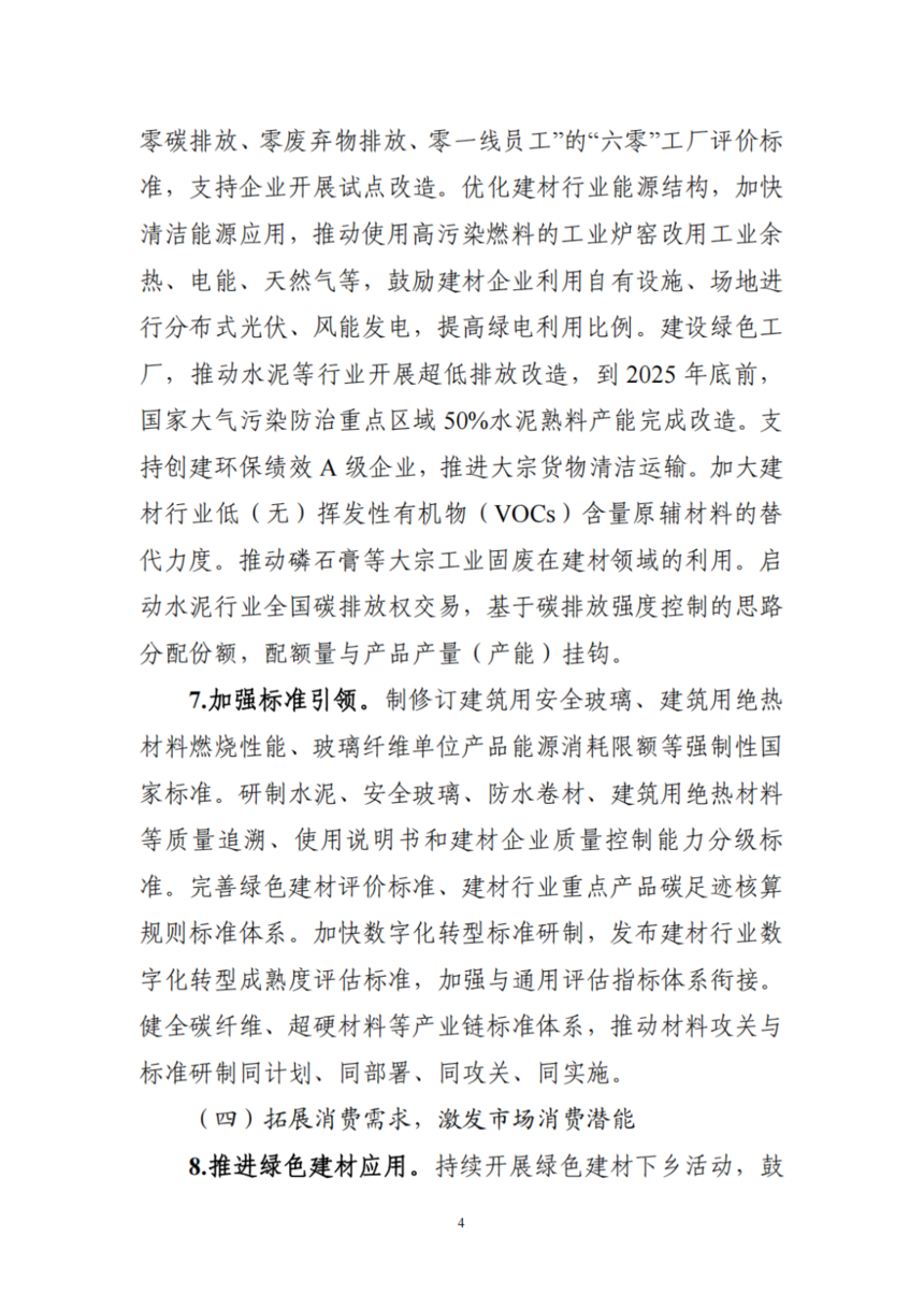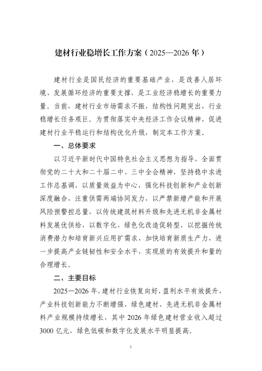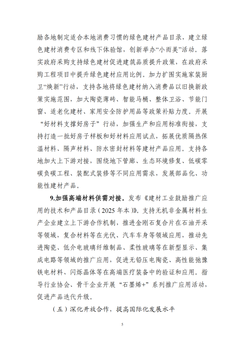 3 促進行業(yè)轉(zhuǎn)型升級,積蓄行業(yè)發(fā)展內(nèi)生動能 高端化、智能化、綠色化轉(zhuǎn)型既是推動行業(yè)高質(zhì)量發(fā)展的必然要求,也是持續(xù)增強行業(yè)發(fā)展內(nèi)生動力,保障行業(yè)長久穩(wěn)定發(fā)展的必然路徑。 《工作方案》以高端化、智能化、綠色化為目標,提出促進行業(yè)轉(zhuǎn)型的系列舉措。一是發(fā)布重點行業(yè)數(shù)字化轉(zhuǎn)型系統(tǒng)解決方案,培育一批典型場景、標桿企業(yè),實施“人工智能+建材”行動,訓練建設建材行業(yè)大模型。二是加快綠色低碳改造,開展建材行業(yè)“零外購電、零化石能源、零一次資源、零碳排放、零廢棄物排放、零一線員工”的“六零”工廠培育行動。三是加強標準對產(chǎn)業(yè)轉(zhuǎn)型支撐,不斷完善標準體系。 4 供需協(xié)同發(fā)力,激發(fā)市場消費潛能 隨著建材產(chǎn)業(yè)結(jié)構(gòu)調(diào)整和需求升級,工業(yè)領(lǐng)域、居民終端消費等對建材行業(yè)的拉動作用不斷增強,“好房子”建設也將為建材行業(yè)發(fā)展提供新的市場空間。 《工作方案》統(tǒng)籌供需兩端,以供給側(cè)提質(zhì)升級,拓展消費需求,激發(fā)市場潛力。一是持續(xù)開展綠色建材下鄉(xiāng)活動,加力擴圍實施家裝廚衛(wèi)“煥新”行動,開展“好材料支撐好房子”行動,加強上下游供需對接。二是支持無機非金屬材料生產(chǎn)企業(yè)建立上下游合作機制,拓展高端領(lǐng)域新需求。 5 加強國際合作,拓展行業(yè)發(fā)展空間 近年來,我國建材商品對外貿(mào)易結(jié)構(gòu)不斷優(yōu)化,國際服務能力不斷增強,深化國際交流合作,將進一步推動建材行業(yè)融入國際建材產(chǎn)業(yè)體系,擴大全球建材“朋友圈”。 《工作方案》提出,發(fā)揮水泥、平板玻璃綠色低碳技術(shù)裝備優(yōu)勢,與共建“一帶一路”沿線國家及地區(qū)聯(lián)合建立研發(fā)機構(gòu)和綠色建材園區(qū),服務國際建材行業(yè)綠色低碳發(fā)展,拓展國際合作空間。 ❖ 多措并舉推動《工作方案》落地見效 一是加強組織保障。確保系列舉措實施到位是促進行業(yè)穩(wěn)增長的關(guān)鍵!豆ぷ鞣桨浮诽岢,將壓實各地區(qū)責任,發(fā)揮重點企業(yè)帶頭作用和行業(yè)協(xié)會橋梁紐帶作用,形成政府、行業(yè)、企業(yè)共同發(fā)力的保落實組織保障。 二是加強政策支持。統(tǒng)籌發(fā)揮宏觀調(diào)控、財政、金融、產(chǎn)業(yè)等政策作用是促進行業(yè)穩(wěn)增長的重要保障!豆ぷ鞣桨浮诽岢觯y(tǒng)籌用好穩(wěn)增長各項存量政策和增量政策,拓展行業(yè)市場,促進發(fā)展新質(zhì)生產(chǎn)力。如,通過城市更新、消費品以舊換新等政策拓展建材消費;發(fā)揮工業(yè)領(lǐng)域設備更新政策作用,促進企業(yè)設備更新和技術(shù)改造;通過首批次應用保險補償機制和產(chǎn)業(yè)投資基金、綠色金融等,壯大培育新興產(chǎn)業(yè)。 三是加強監(jiān)測調(diào)度。及時開展行業(yè)監(jiān)測調(diào)節(jié)是促進行業(yè)穩(wěn)增長的必要舉措!豆ぷ鞣桨浮诽岢,將通過“強化對建材大省、重點企業(yè)運行調(diào)度,完善重點產(chǎn)品產(chǎn)能預警機制、及時發(fā)布預警信息,加強對生產(chǎn)要素監(jiān)測,發(fā)布建筑材料工業(yè)景氣指數(shù)”等系列舉措,引導行業(yè)預期,推進行業(yè)平穩(wěn)有序發(fā)展。 《工作方案》的發(fā)布,對指導建材行業(yè)應對當前行業(yè)下行壓力、促進行業(yè)穩(wěn)增長指明了工作方向,對推動建材行業(yè)轉(zhuǎn)型升級,夯實產(chǎn)業(yè)長遠發(fā)展基礎(chǔ)具有重要的作用。中國建筑材料聯(lián)合會將廣泛協(xié)調(diào)行業(yè)內(nèi)外資源,積極組織推動穩(wěn)增長系列舉措落到行業(yè)實際行動中,為建材行業(yè)平穩(wěn)健康發(fā)展提供支撐保障。 ❖ 原文如下 關(guān)于印發(fā)《建材行業(yè)穩(wěn)增長工作方案(2025—2026年)》的通知 工信部聯(lián)原〔2025〕185號 各省、自治區(qū)、直轄市及計劃單列市、新疆生產(chǎn)建設兵團工業(yè)和信息化、自然資源、生態(tài)環(huán)境、住房城鄉(xiāng)建設、水利、農(nóng)業(yè)農(nóng)村主管部門,有關(guān)中央企業(yè)、行業(yè)協(xié)會: 現(xiàn)將《建材行業(yè)穩(wěn)增長工作方案(2025—2026年)》印發(fā)給你們,請結(jié)合實際認真抓好落實。